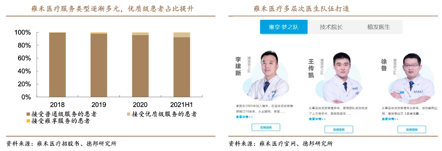 經典案例:根據雍禾醫療招股書、雍禾醫療官網、德邦研究所等綜合資訊表明,雍禾醫療醫療植發建立三層等級服務體系,以滿足患者的多樣化需求。公司提供三 級根據醫生經驗及技能加以區分的植發醫療服務,包括:1)普通級服務:針對接 受標準植發手術的患者,收取人民幣 2 萬元至 3 萬元;2)優質級服務:針對院長、主任或副主任進行升級和定制化植發手術的患者,收取 3 萬元至 5 萬元;3)貴賓級雍享服務:針對接受由業內知名植發專家進行個性化植發手術的患者,收取逾 10 萬元。
