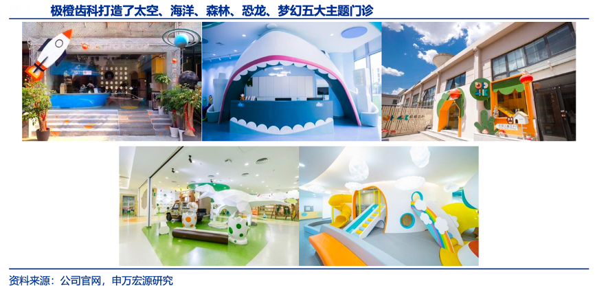 經典案例:根據公司官網、申萬宏源研究等綜合資訊表明,極橙以“幫孩子快樂看牙”為使命,首創沉浸式游戲化看牙體驗,并將每家診所都打造成孩子的“主題游樂場”,為孩子開發身臨其境的體驗。現已有太空、海洋、森林、海陸空三大 主題。