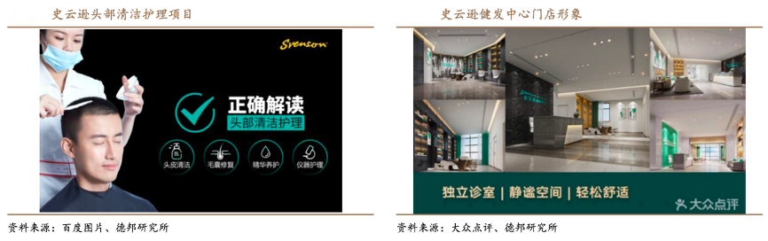 經典案例:根據百度圖片、大眾點評、德邦研究所等綜合資訊表明,史云遜健發中心 1957 年成立于倫敦,擁有國際自身發理學科研成就和在全球 50 余年的專業健發經驗,倡導“完美秀發源自頭皮健康”的全新頭皮護理和健發概念,為越來越多現代都市人群解決各種頭皮頭發問題。截止招股最后實際可行 日期,公司已在 51 家植發醫療機構中設有史云遜醫學健發中心。健發中心注冊醫生可為患者提供專業建議與整體治療,結合激光與光療等程序,并使用代表領先毛發科學的醫療設備與藥物,并幫助患者改善生活方式以增進頭發與頭皮的健康。