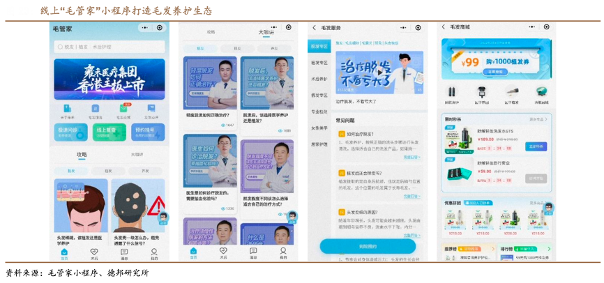 經典案例:根據毛管家小程序、德邦研究所等綜合資訊表明,雍禾醫療公司積極推進在線醫療服務,已建立一支在線醫療團隊,在微信小程序上開發“毛管家”小程序,擁有超 81 萬名注冊用戶,可為患者進行植發手術介紹、查詢醫生執照及價格信息等,可實時上傳患者病歷等文件,從而提供便捷專業的在線咨詢、術后復查服務,提升手術透明性,引導行業規范化。