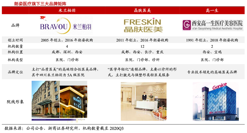 經典案例:根據公司公告、浙商證券研究所等綜合資訊表明,2016年朗姿切入醫美賽道,三大事業部各具特色。2017年公司成立全資子公司朗姿醫療用于統籌醫美業務運營和管理,目前朗姿醫療旗下擁有米蘭柏羽、晶膚醫美、高一生三大事業部,分別定位高端/輕醫美/專業技術,2019年朗姿醫療收入/凈利潤/歸母凈利體量達到6.3/0.87/0.52 億元。