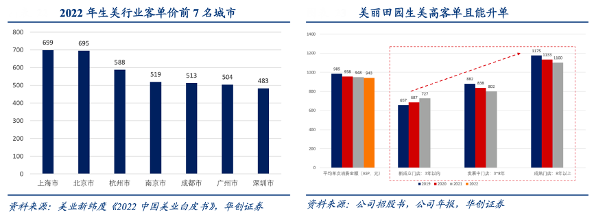 經典案例:根據美業新緯度、公司招股書、公司年報、華創證券、等綜合資訊表明,傳統美容服務的客單價在400 元至 1500 元 之間,中高端客戶的客單價在 800 元至 1500 元。美麗田園布局中高端商場,定位中高端客戶,以上海為例,美麗田園在恒隆廣場、萬象城、K11、BFC 外灘金融中心、久光中心等高端商場均有布局,基于此,美麗田園 ASP 較高,2022 年為 943 元。且伴隨門店爬 坡,美麗田園具備升單能力,2021年新成立門店(3 年以下門店)、發展中門店(3~8 年)、成熟門店(8 年以上門店)的 ASP 分別為 727、802、1100 元,高于上海平均客單699 元。