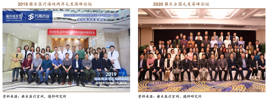 經(jīng)典案例:根據(jù)雍禾醫(yī)療官網(wǎng)、德邦研究所等綜合資訊表明,雍禾醫(yī)療公司 2020 年在鄭州與杭州舉辦雍禾醫(yī)療毛發(fā)高峰論壇。2019 年雍禾醫(yī)療與萬晟藥業(yè)聯(lián)合主辦的全國(guó)毛發(fā)主題巡講,聚集國(guó)際頂尖植發(fā)專家與國(guó)內(nèi)行業(yè)精英代表進(jìn)行巔峰對(duì)話,深度探討植發(fā)行業(yè)發(fā)展趨勢(shì)和技術(shù)創(chuàng)新未來發(fā)展。