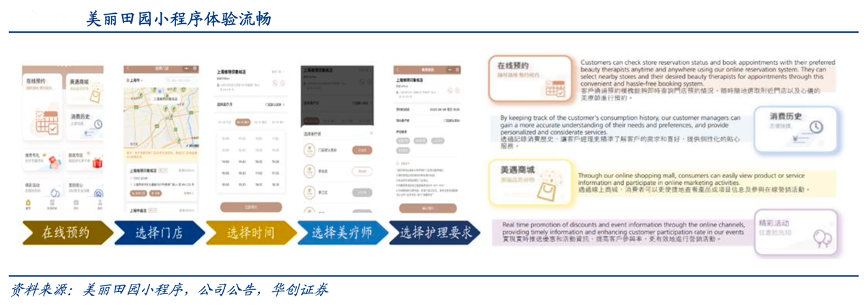 經(jīng)典案例:根據(jù)公司公告、美麗田園小程序、華創(chuàng)證券等綜合資訊表明,美麗田園當(dāng)前公司數(shù)據(jù)平臺(tái)涉及區(qū)域發(fā)展模型、門店運(yùn)營(yíng)支持模型、 客戶分析模型、員工發(fā)展模型,其中客戶關(guān)系管理系統(tǒng)中涵蓋 96 項(xiàng)客戶標(biāo)簽,用戶畫像 完整,利于挖掘客戶需求(如生美和醫(yī)美相互賦能)和喚醒沉睡客戶。2020 年初公司上線“美田在線”小程序,涵蓋線上預(yù)約、信息發(fā)布、營(yíng)銷活 動(dòng)、直播體驗(yàn)、線上商城、服務(wù)回訪等,實(shí)現(xiàn)從預(yù)約→消費(fèi)→服務(wù)反饋的閉環(huán)。