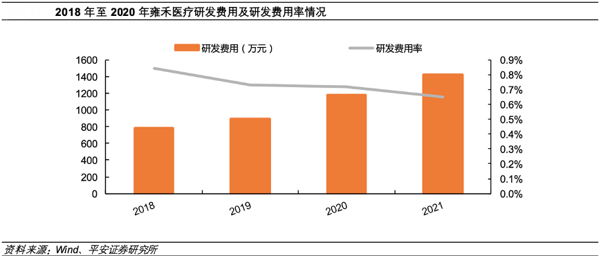 經典案例:根據wind、平安證券研究所等綜合資訊表明,雍禾醫療公司的 LATTICE 點陣加密技術,是針對天生頭發稀疏,發質細軟,因脫發導致頭頂頭發稀疏等情況研發出的植發技術,做到對原有頭發的“0”損傷。2018 年至 2021 年,公司的研發費用(781/887/1181/1416 萬元)不斷增加,研發費用率 ( 0. 84% / 0. 73%/ 0.72% /0. 65%)略有下滑穩定。