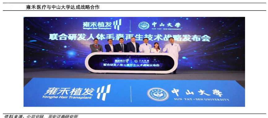 經(jīng)典案例:根據(jù)公司官網(wǎng)、平安證券研究所等綜合資訊表明,雍禾醫(yī)療與中山大學(xué)達(dá)成戰(zhàn)略合作,研究異體毛囊移植免疫排斥解決方案、新型預(yù)防焦慮誘導(dǎo)脫髮的小分子藥物開發(fā)、多功能型植髮手術(shù)床、溫和型泡沫洗髮水等,并初步取得成果。2021年,公司與四川大學(xué)華西醫(yī)院合作雄脫治療新靶點(diǎn)項(xiàng)目,進(jìn)一步在防脫植發(fā)領(lǐng)域深耕。