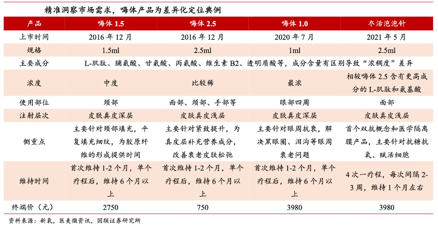 經典案例:根據新氧、醫美微資訊、國聯證券研究所等綜合資訊表明,精準洞察市場需求,嗨體產品成為差異化定位典例。2016 年、2020 年、2021 年 陸續推出嗨體頸紋針、嗨體水光針、嗨體熊貓針、冭活泡泡針,產品定位覆蓋頸部、 框周與面部,定價覆蓋入門級、中高端系列,滿足市場多樣化需求。