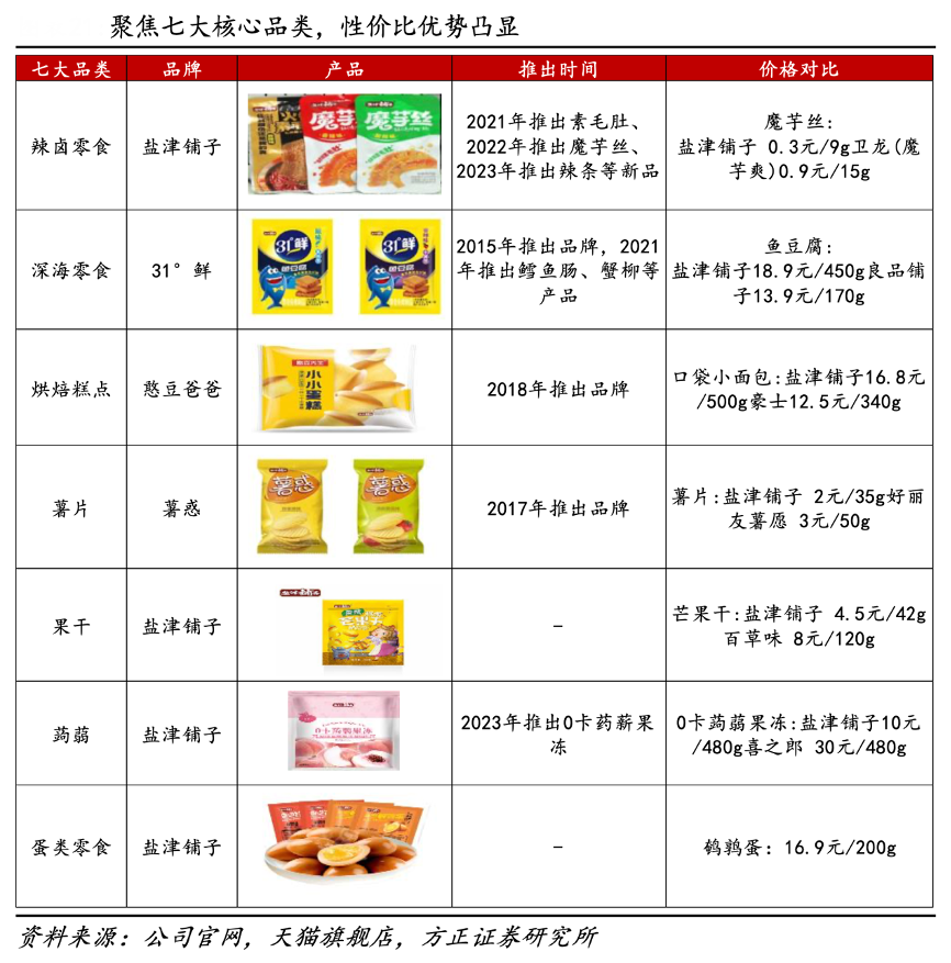 經(jīng)典案例:根據(jù)公司官網(wǎng)、天貓旗艦店、方正證券研究所等綜合資訊表明,自 2021 年按照“多品牌、多品類、 全渠道、全產(chǎn)業(yè)鏈、(未來)全球化”中長期戰(zhàn)略發(fā)力以來,鹽津鋪?zhàn)庸咀龃笞鰪?qiáng)“鹽津 鋪?zhàn)?rdquo;辣鹵零食、“31°鮮”深海零食,“憨豆爸爸”烘焙食品、“薯之惑”焙烤薯片、蛋類零食“蒟蒻滿分”蒟蒻果凍、果干堅(jiān)果七大核心品類,產(chǎn)品品牌定位“好吃不貴,國民零食”,實(shí)現(xiàn)高品質(zhì)+高性價(jià)比的產(chǎn)品。