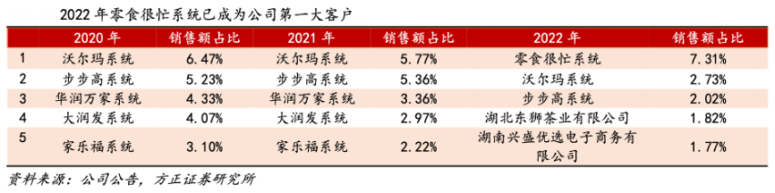 經典案例:根據公司公告、方正證券研究所等綜合資訊表明,鹽津鋪子公司率先布局零食專營系統,目前已與頭部品牌建立合作關系。公司于 2021 年與零食很忙達成合作,成為率先布局零食專營系統的上市公司品牌之一。目前公司在零食很忙的 SKU 已逐步拓展至約 40 多個,涵蓋多個核心品類,并不斷上新品。2022 年,零食很忙已超越超越沃爾瑪成為公司第一大客戶,公司的報表端在零食很忙實現 2.11 億元的銷售額。