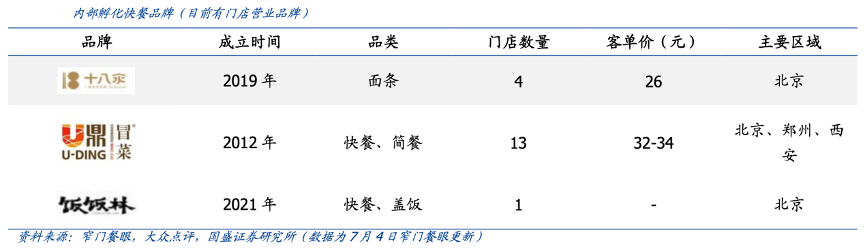 經典案例:根據窄門餐眼、大眾點評、國盛證券研究所等綜合資訊表明,海底撈主要通過內部孵化品牌橫向延申,目前已孵化品牌有 U 鼎冒菜、十八汆、撈派有面兒等;外部收購品牌有漢舍中國菜、Hao Noodle 等。孵化品牌大多數是客單價 20-30 元的快餐,可復制性強、投入低,海底撈可利用自身成熟的產業鏈保駕護航、快速切入快餐賽道。