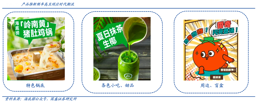 經(jīng)典案例:根據(jù)海底撈公眾號、國盛證券研究所等綜合資訊表明,海底撈的推新頻率頗高,在菜品創(chuàng)新及融合上做到極具特色,同時迎合當(dāng)代年輕人喜好,推出網(wǎng)紅產(chǎn)品,每次推出新品都能在各大網(wǎng)絡(luò)平臺掀起一股潮流。海底撈會根據(jù)不同地區(qū)飲食習(xí)慣推出地區(qū)特定菜單,除官網(wǎng)上公布的經(jīng)典鍋底外,還有如廣州海南地區(qū) 的牛肉湯鍋底、青椒鍋底、參鮑雞金湯鍋;天津、山東地區(qū)的雞湯豆花鍋底等。