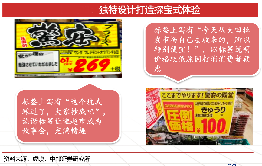經(jīng)典案例:根據(jù)虎嗅、中郵證券研究所等綜合資訊表明,唐吉訶德對于主推商品,每一家門店在價(jià)格標(biāo)簽之外附上員工“心聲”,無形之中拉進(jìn)消費(fèi)者和員工的距離,變“銷售員”為“朋友”,化“推銷商品”為“推薦商品”。而詼諧幽默又一針見血的標(biāo)簽即構(gòu)成探寶本身,讓本身只是為了滿足剛需的剛需轉(zhuǎn)變?yōu)樾蓍e娛樂的購物,用“探寶式體驗(yàn)”增加顧客購物頻次、打消顧客對于低價(jià)商品顧慮,一箭雙雕。