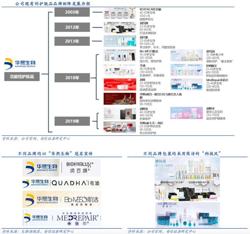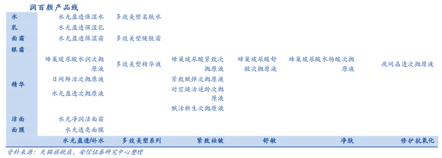經典案例:根據天貓旗艦店、安信證券研究中心等綜合資訊表明,目前華熙生物已經有較為明顯明星產品的品牌“潤百顏”和“肌活”為例,均先用明星單品次拋原液/肌底液系列拓展不同功效領域,對標修麗可已經覆蓋了除美白以外的大部分功效領域。