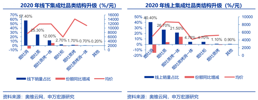 經(jīng)典案例:根據(jù)奧維云網(wǎng)、申萬宏源研究等綜合資訊表明,2020年集成灶銷售量口徑的細(xì)分品類結(jié)構(gòu)中,占比最大的細(xì)分品類依然為煙灶消(即油煙機、燃?xì)庠睢⑾竟褚惑w),線下占比 57.4%,線上占比 40.4%,煙灶蒸為第二大品類,線上和線下分別占比 26.7%和 25.3%,煙灶蒸烤一體機為第三大品類,線上占比大幅提升至 21.5%,線下占比 12%。從份額變化趨勢來看,煙灶消銷量占比明顯下降,同時價位更高的煙灶蒸、煙灶蒸烤一體機銷量占比均有所上升,品類結(jié)構(gòu)的調(diào)整帶動集成灶行業(yè)整體均價上行。