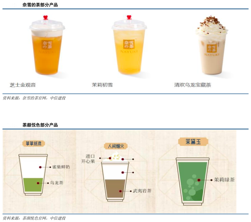 經典案例:根據奈雪的茶公司官網、茶顏悅色官網、中信建投等綜合資訊表明,“奈雪的茶”茶飲品類深度結合中國傳統茶品類:如烏龍鐵觀音、綠茶毛峰、茉莉茶等,茶顏悅色則主打茶文化和中國 風,在產品設計上凸顯中國文化元素。在繼承茶文化的同時,新式茶飲紛紛打造自己的品牌文化,深得新一代 消費者的熱愛。