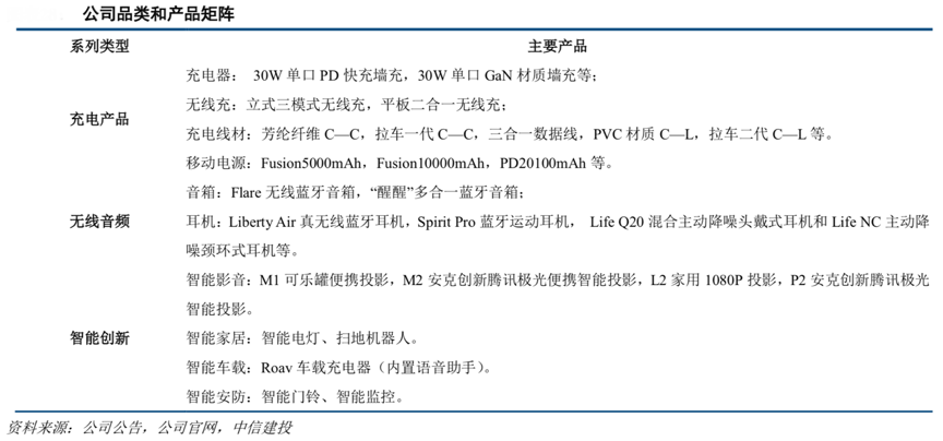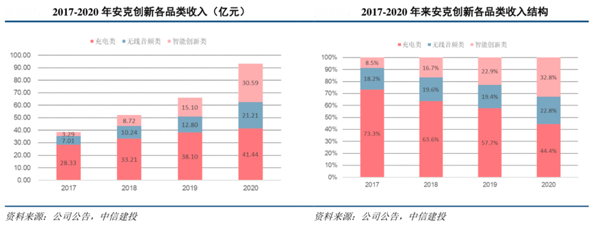 經(jīng)典案例:根據(jù)公司公告、公司官網(wǎng)、中信建投等綜合資訊表明,安克創(chuàng)新2017-20 年收入由 28.33 億元增至41.44 億元,CAGR 為 13.5%。無線音頻類和智能創(chuàng)新類兩大新銳品類 2017-20年收入 CAGR 分別為44.6%、110.3%,2020 年收入分別 21.21 億元、30.59 億元,合計(jì)占比已超55%,反映公司多元化推進(jìn)效果優(yōu)異,尤其是智能創(chuàng)新類增長(zhǎng)迅猛,2019年收入已超越無線音頻類,2020年繼續(xù)同比高增102.63%。