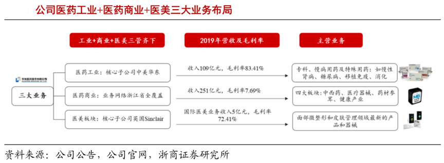 經(jīng)典案例:根據(jù)公司公告、公司官網(wǎng)、浙商證券研究所等綜合資訊表明,華東公司業(yè)務(wù)覆蓋醫(yī)藥全產(chǎn)業(yè)鏈,以醫(yī)藥工業(yè)為主導(dǎo),積極拓展醫(yī)藥商業(yè)和醫(yī)美產(chǎn)業(yè),已發(fā)展成為集醫(yī)藥研發(fā)、生產(chǎn)、經(jīng)銷為一體的大型綜合性醫(yī)藥公司。藥商業(yè):收入占比 69%,毛利率 7.7%,公司收入主要來源,2019年其醫(yī)藥商業(yè)板塊營(yíng)收達(dá)到 251 億元,繼續(xù)保持浙江省龍頭地位。