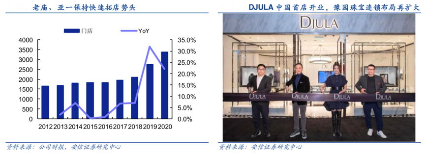 經(jīng)典案例:根據(jù)公司財報、公司招股說明書、安信證券研究中心等綜合資訊表明,珠寶時尚業(yè)務(wù)是豫園股份公司支柱產(chǎn)業(yè)之一 ,旗下?lián)碛?ldquo;老廟”和“亞一”兩大知名品牌,以直營零售、批發(fā)為主要模式拓展連鎖網(wǎng)絡(luò),2020 年老廟 亞一門店凈增 608 家、保持快速拓店勢頭,截止 2020 年末門店數(shù)增至 3367 家(其中 3160 家加盟店),同時收購法國珠寶品牌 Djula,亦已在京滬開有直營店 12 家。