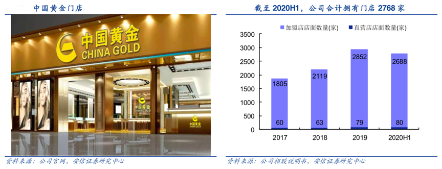 經(jīng)典案例:根據(jù)公司官網(wǎng)、公司招股說明書、安信證券研究中心等綜合資訊表明,中國黃金公司通過在北京、上海、廣州等高線 級城市購物中心開設(shè)直營店打造品牌形象,通過在低線級城市開設(shè)加盟店擴張規(guī)模,截至 2020 上半年,公司擁有門店 2768 家,其中加盟店 2688 家,直營店 80 家。