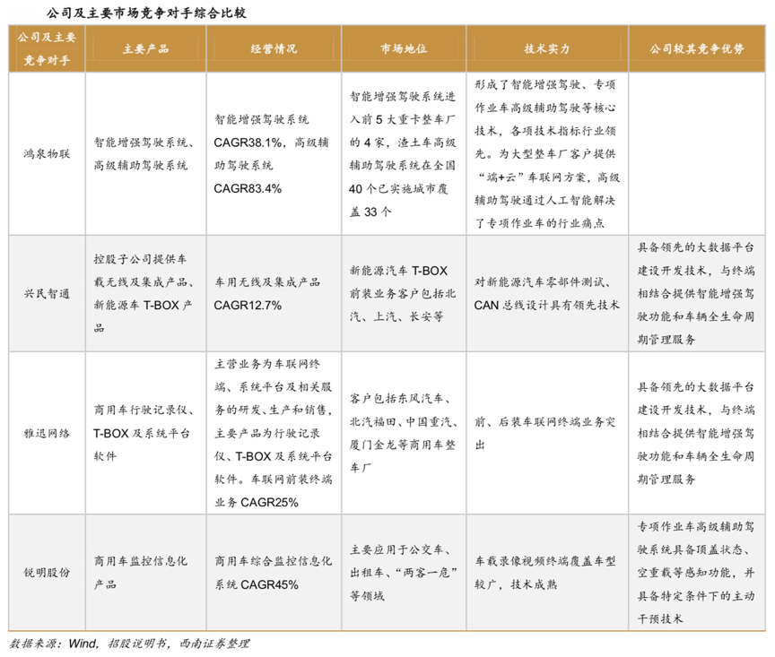 經(jīng)典案例:根據(jù)wind、招股說明書、西南證券等綜合資訊表明,持續(xù)的高研發(fā)投入,使得鴻泉物聯(lián)公司積累了大量的知識產(chǎn)權(quán)和核心技術(shù),與行業(yè)可比公司橫向比較可以發(fā)現(xiàn),其在大數(shù)據(jù)平臺建設(shè)開發(fā)技術(shù)、智能增強(qiáng)駕駛功能和車輛全生命周期管理服務(wù)等核心技術(shù)服務(wù)方面有較強(qiáng)的競爭優(yōu)勢。