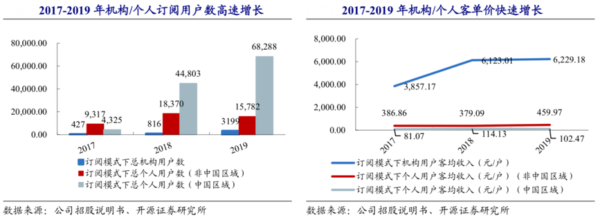 經典案例:根據公司招股說明書、開源證券研究所等綜合資訊表明,福昕軟件公司訂閱收入的高速增長得益于客戶數量的快速增長及客單價的提升。其機構/個人訂閱客戶數量快速增長。2017-2019年其 機構客戶數量分別為427 戶、 816 戶和 3,199 戶,分別增長 91.10%和 292.03%。隨著公司知名度的提升及公司對中國市場的開拓,非中國區域與中國區域的個人客戶數量均實現較快增長。