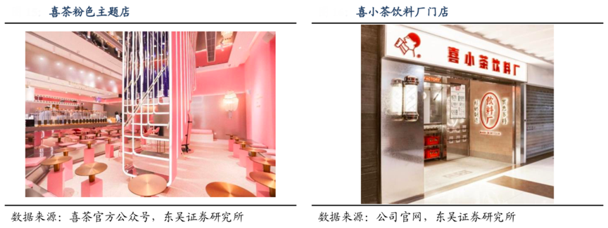 經(jīng)典案例:根據(jù)喜茶官方公眾號(hào)、公司官網(wǎng)、東吳證券研究所等綜合資訊表明,為了針對(duì)不同消費(fèi)場(chǎng)景的廣大消費(fèi)者,新茶飲頭部品牌紛紛開(kāi)設(shè)多種類型的茶飲店,包括主題店、快閃店、特色店等,這些門店具有現(xiàn)代風(fēng)格的室內(nèi)裝飾和時(shí)尚空間。如喜茶在2017 年推出了黑金店、粉色主題店等;2020 年 4 月喜茶還推出了定位大眾市場(chǎng)的“喜小茶”飲料廠等.