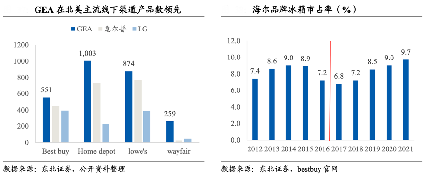 經(jīng)典案例:根據(jù)東北證券、bestbuy官網(wǎng)、公開資料等綜合資訊表明,GEA 擁有完善的供應(yīng)鏈網(wǎng)絡(luò),在美國擁有9 家制造工廠,13 個分銷中 心及 143 個區(qū)域貨運(yùn)中心,配送服務(wù)覆蓋全國 90%地區(qū)。通過北美家電線上渠道官網(wǎng)如 Bestbuy,Home depot 等我們可以看 到,GEA 產(chǎn)品在北美各大渠道銷售數(shù)量領(lǐng)先。除了傳統(tǒng)大型商超以外,GEA 與 Sears 等全美四大連鎖家電零售商也長期保持合作關(guān)系。海爾收購 GEA 后,借用 GEA 的 渠道,逐步推廣海爾品牌的產(chǎn)品,自 2016 年后,海爾品牌的冰箱市場份額實(shí)現(xiàn)了快 速穩(wěn)定增長。