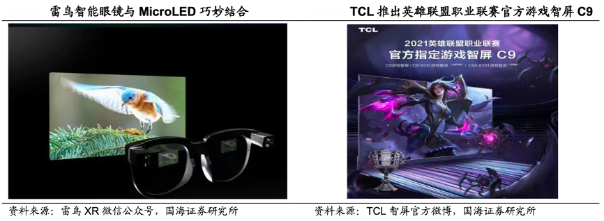 經典案例:根據雷鳥XR微信公眾號、TCL智屏官方微博、國海證券研究所等綜合資訊表明,TCL電子公司積累多項 AR 關鍵 技術專利,2021 年 10 月發布 Micro LED 全息光波導 AR 眼鏡“雷鳥智能眼鏡 先鋒版”,其從產品端打入年輕化圈層,與 IMAX 達成深度合作,定位“Z世代第一個家庭私人影院”,巨幕智屏 Q6E 具有電競六神裝,具備大內存、低延遲、高刷新率等配置。2021年 TCL 與 EDG 戰隊進行戰略合作,戰隊奪冠后再次刷新TCL 于 Z世代電競愛好者心中的存在感。