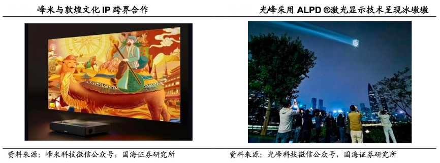 經典案例:根據峰米科技微信公眾號、國海證券研究所等綜合資訊表明,光峰科技曾在首鋼園打造 1.4 萬平米大型光影秀,采用 ALPD®激 光顯示技術點亮國家跳臺滑雪中心“雪如意”,并將備受 Z 世代追捧的網紅“冰墩墩”投影于深圳夜空,借北京冬奧一舉擴大品牌影響力;同時探索跨界營銷新模式,舉辦“聲色無界”敦煌激光藝術展,直觀展現激光電視 T1 的高品質 聲色,同時以傳統文化之美觸動 Z 世代國風圈層。
