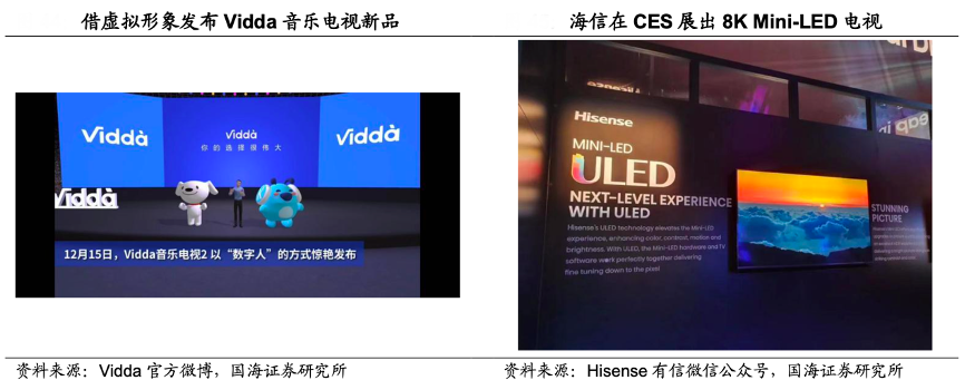 經典案例:根據雷Vidda官方微博、Hisense有信微信公眾號、國海證券研究所等綜合資訊表明,海信視像公司在VR 虛擬現實技術領域擁有深度儲備,擁有海信 VR 一體機及聚好看云 VR 直播 平臺,以“數字人”虛擬形象對Vidda 音樂電視 2 代 V5G 進行發布,為 Z 世代 提供新鮮感;其引領激光顯示技術發展,于 2022 年 1 月展示 8K 激光顯示 解決方案和 8K 120HZ 畫質芯片和 8K Mini-LED 電視,成本降低 45%,更高“質價比”兼顧 Z 世代 對感性與理性的需求。