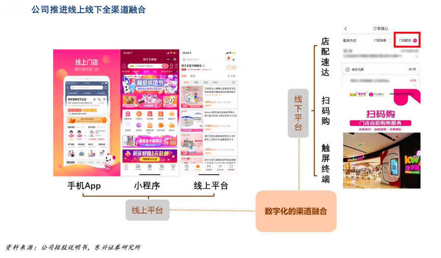 經典案例:根據公司招股說明書、東興證券研究所等綜合資訊表明,孩子王公司已完成線上線下融合的數字化搭建,消費者可通過線上平臺、APP、微信小程序,或線下觸屏終端、“掃碼購”自助下單、“店配速達”等多種渠道獲得更加流暢、便捷的消費體驗。其可通過全渠道營銷網絡建立品牌和用戶互相 感知和交互的多個觸點,及時準確地滿足消費者全方位的消費需求。