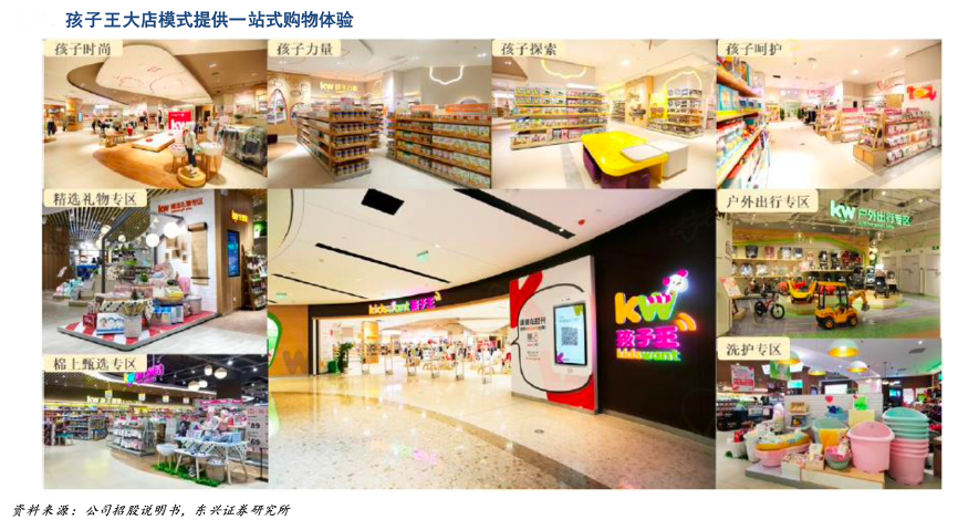 經典案例:根據公司招股說明書、東興證券研究所等綜合資訊表明,孩子王在全國首創大店模式,平均單店面積約 2500 平方米,最大單店面積超過 7000 平方米,且均采取直營模 式,而同業參與者均以 1000 m²以下的中小店為主,且多以加盟形式為主。其單店面積較大,商品種類豐富,涵蓋了嬰幼兒的衣、食、住、行,為消費者提供了“一站式”的良好購物體驗。同時,在提供母嬰產品服務的基礎上,其還提 供兒童游樂場及 母嬰配套服務,增加了玩、學 、交流互動等體驗場景,形成了“商品+服務+社交”的創新性運營模式,在行業內形成了較為獨特的競爭優勢。