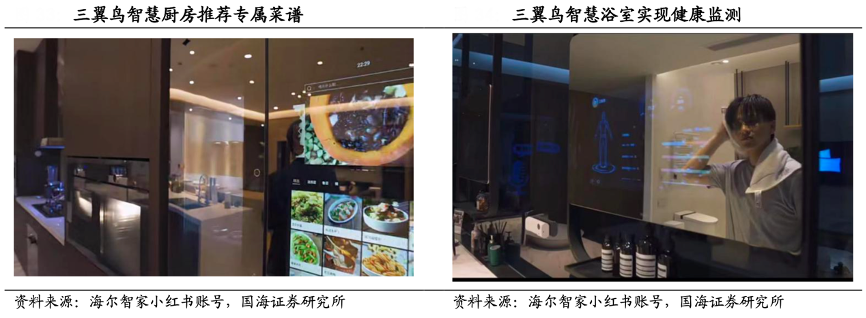 經典案例:根據海爾智家小紅書帳號、國海證券研究所等綜合資訊表明,海爾智家公司開拓場景化賽道,“黑科技”是三翼鳥的代名詞,其打造的智慧客廳可實現場景迅速切換,智慧廚房中冰箱可為用戶自動下單補貨,根據用戶口味和體制提供個性化菜譜、智慧浴室中魔鏡可顯示身體報告等,緊抓 Z 世代獵奇心理。