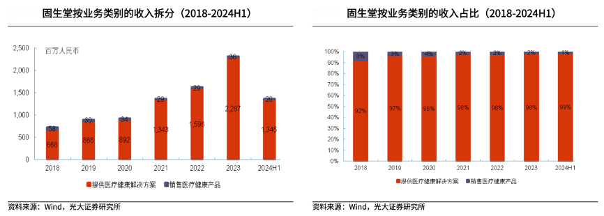 經典案例:根據wind、光大證券研究所等綜合資訊表明,固生堂主要業務分為醫療健康解決方案和銷售醫療健康產品兩大板塊,其中醫療健康解決方案為收入主要來源。醫療健康解決方案服務包括提供診前準備、優質的問診與診斷、理療、中醫處方及煎藥服務。提供醫療健康解決方案的收入占比由 2018 年的 92%提升至 2024H1 的 99%,呈逐年提升趨勢。