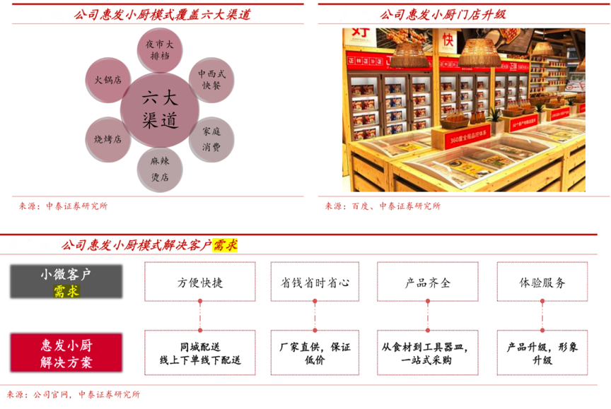 經典案例:根據公司官網、中泰證券研究所等綜合資訊表明,“惠發小廚”是惠發食品公司 2018 年開始嘗試的一種業務模式,通過開設食材(火鍋燒烤麻辣燙 等)一站式采購連鎖超市,包含 600 多種食材,每一種均由廠家直供,解決火鍋料產品采購品類眾多、費時費力的現狀,滿足消費者一站式低價購齊需求,其本質上是一種一站式食材服務體系。惠發小廚覆蓋六大渠道,引爆火鍋店、燒烤店、麻辣燙店、中西式快餐、夜市大排檔以及家庭消費等。