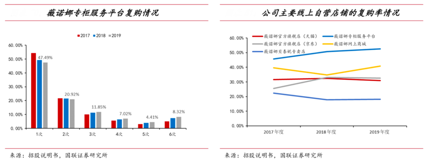 經(jīng)典案例:根據(jù)招股說明書、國聯(lián)證券研究所等綜合資訊表明,薇諾娜專柜服務平臺客戶的購買頻次在 2 次及以上的客戶數(shù)量占比較高,2017- 2019 年逐年提升,分別為 45.61%、50.70%、52.51%。其客單價較高,主要集中于 1,001-20,000 元區(qū)間內,而其線上自營店鋪用戶在快速增長的同時,復購率保持 30%左右。