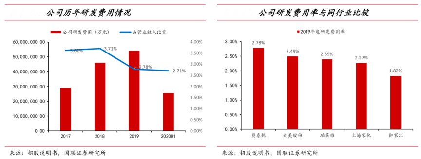 經(jīng)典案例:根據(jù)招股說明書、國聯(lián)證券研究所等綜合資訊表明,截至 2020 年上半年,貝泰妮擁有境內有效專利46 項, 并掌握 11 項核心技術,在利用馬齒莧、青刺果、滇山茶等高原特色植物進行植物提取物的有效成分制備,以及生產(chǎn)含有高原特色植物活性成分的敏感肌膚護理產(chǎn)品方面具有較強的技術優(yōu)勢。2017-2019 年其研發(fā)費用的年復合增速為 37%,2019 年研發(fā)費用率為 2.78%, 高于同行業(yè)其他可比上市公司。