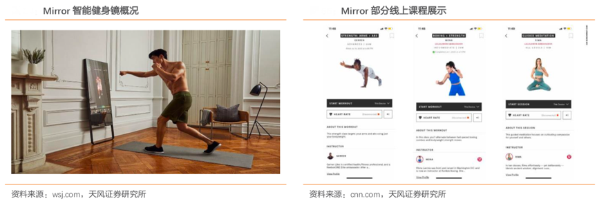 經典案例:根據公司官網、wsj.com、cnn.com、天風證券研究所等綜合資訊表明,Lululemon于 2020 年 7 月斥資5 億美元完成對 mirror 智能健身設備并購,先發布局數字化智能居家健身業務。其在新冠疫情背景下瞄準未來部分客群居家運動健身需求,看重 mirror 自身獨特功能:通過內置探測器實時提供機體實時數據跟蹤,并為使用者提供 指導意見;針對不同類型運動人群上傳標準教練課程至數字云端,用戶可以通過 mirror 終 端實現自由重復練習,助力 Lululemon 推進可記憶(memorable)、可分享(shareable)、 可重復使用(repeatable)、高品牌黏性(addictive)全零售渠道建設。