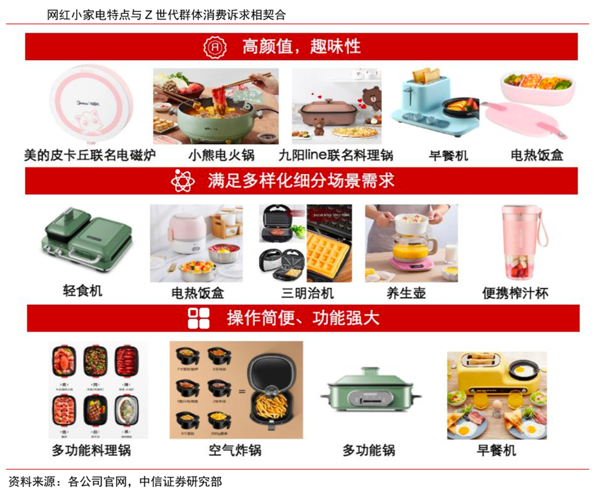 經典案例:根據各公司官網、中信證券研究部等綜合資訊表明,年輕群體品牌忠誠度降低、產品功能需求多樣、購物存在功能、顏值、體驗、社交多維度考量,“體驗式消費”和“悅己式消費”已成為主要消費特征??v觀爆款小家電其均具備(顏值高、設計感強;直擊細分場景痛點;多功能、易操作)的特點,深度契合了年輕消 費群體的新偏好、新訴求。