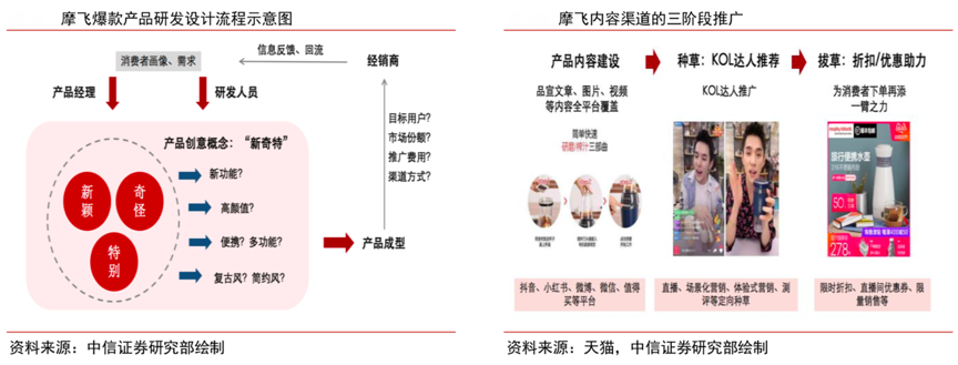 經典案例:根據中信證券研究、天貓等綜合資訊表明,摩飛深化“爆款產品+內容營銷”打法,在內部專門成立國內品牌事業部,由不同的專業銷售團隊負責不同品牌的品牌策劃、研發設計和品質管控。并由內容經理通過社交電商和內容電商進行營銷推廣,基本過程可以劃分為產品內容基礎建設、種草、拔草三個階段,通過碎片化的營銷達到高覆蓋和深滲透 的效果,最終成功形成了多款爆品。
