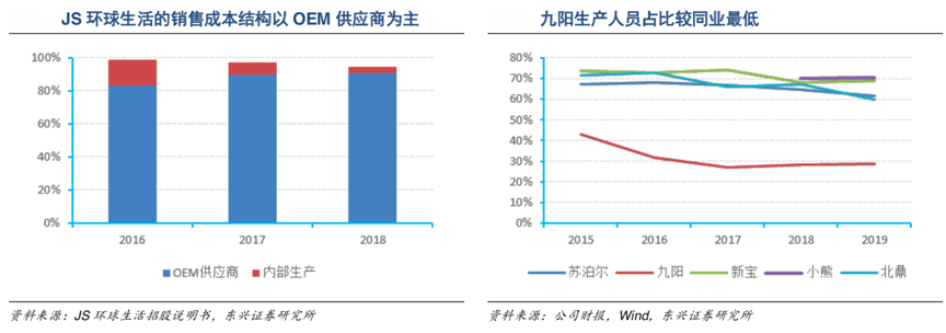 經典案例:根據JS環球生活招股說明書、公司年報、wind、東興證券研究所等綜合資訊表明,JS 環球生活 2016 年、2017 年及 2018 年從 OEM 供應商采購的制成品成本分別占同期銷售成本的 83.2%、89.3% 及 90.8%,而原材料及組件僅占 15.7%、7.4%及 3.9%;九陽生產人員占比也較同業顯著更低,九陽供應鏈整合能力大大增強。