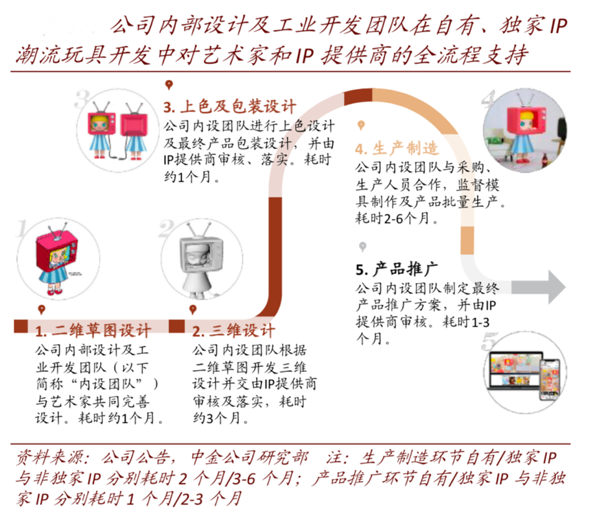 經典案例:根據公司公告、中金公司研究部等綜合資訊表明,泡泡瑪特憑借多年打造的潮玩一體化產業鏈,可以實現在藝術家發掘、IP 開發運營 支持以及下游推廣三個核心環節的全方位支持,不僅提高了 IP 孵化運營的專業性和效率, 也對有志于加入潮玩文化圈的藝術家和設計師具有強大的吸引力。