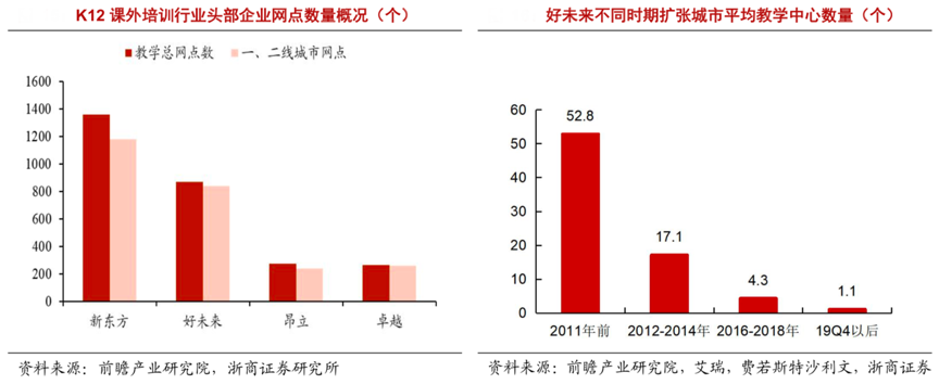 經(jīng)典案例:根據(jù)前瞻產(chǎn)業(yè)研究院、艾瑞、弗若斯特沙利文、浙商證券研究所等綜合資訊表明, K12 行業(yè)龍頭新東方、好未來、昂立、卓越網(wǎng)點(diǎn)大量分布于一、二線城市,一二線城市網(wǎng)點(diǎn)占比高達(dá) 85%以上,而三、四線城市受制于家庭教育觀念、經(jīng)濟(jì)水平和教育資源,存在著網(wǎng)點(diǎn)數(shù)量少、下沉難度大等困難。以好未來為例,其始終致力于線下網(wǎng)點(diǎn)的擴(kuò)張。隨著一、二線城市布局完成,其網(wǎng)點(diǎn)向下沉市場(chǎng)延伸,但下沉城市網(wǎng)點(diǎn)密度依然很小。