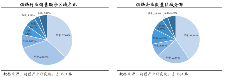 地域化,分域拓展,多地域開發(fā)。根據前瞻產業(yè)研究院、東北證券等綜合資訊表明,從區(qū)域分布來看,華東、華中地區(qū)共占據全國近70%的銷售額,烘焙企業(yè)數(shù)量大多集中在華東(40.38%)、華中(22.95%),“地域化經營”特征明顯,大量烘焙企業(yè)也是圍繞著區(qū)域消費者做“深度經營”,以消費拉動生產,“區(qū)域化深度經營”成為烘焙食品企業(yè)的關鍵成長路徑之一。
