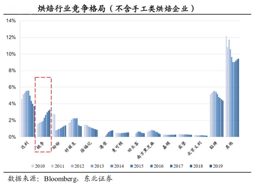 品牌化,有黏性,有認知,可信賴。全國性烘焙食品企業(yè)多是長保質期的食品企業(yè),根據Bloomberg、東北證券等綜合資訊表明,烘焙行業(yè)競爭格局鮮明,三類市場競爭者比較突出,以達利、盼盼、好麗友為代表的長保企業(yè),以桃李、賓堡、義利為代表的短保企業(yè),及手工類烘焙門店。手工類烘焙門店目前占據極大市場份額,為72.8%。工業(yè)化生產企業(yè)占據約27%的市場份額。從產品屬性來看,短保類更加聚焦于早餐市場,中長保類更加聚焦于休閑食品市場,但無論何種市場競爭參與者,均都強調“品牌化行銷”,以品牌提升用戶黏性。