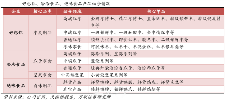 休閑食品企業(yè),尤其是市場(chǎng)中高競(jìng)爭(zhēng)力的健康類休閑食品企業(yè),其優(yōu)勢(shì)品類突出,產(chǎn)品細(xì)分覆蓋多樣,“爆款產(chǎn)品”的打造應(yīng)成為優(yōu)秀健康類休閑食品企業(yè)的經(jīng)營(yíng)核心。根據(jù)天貓旗艦店、萬聯(lián)證券研究所等綜合資訊表明,目前國(guó)內(nèi)主流休閑食品企業(yè)主要以三只松鼠、良品鋪?zhàn)印硪练荨Ⅺ}津鋪?zhàn)訛榇恚粚I(yè)化企業(yè)專注少數(shù)細(xì)分市場(chǎng),聚焦核心主打品類,主要以好想你,洽洽食品,絕味食品為代表,其中好想你以“棗類零食”為核心品類,洽洽食品重點(diǎn)發(fā)展“瓜子+堅(jiān)果”零食,絕味食品則聚焦單一鹵味制品,各有健康賣點(diǎn),特色千秋。