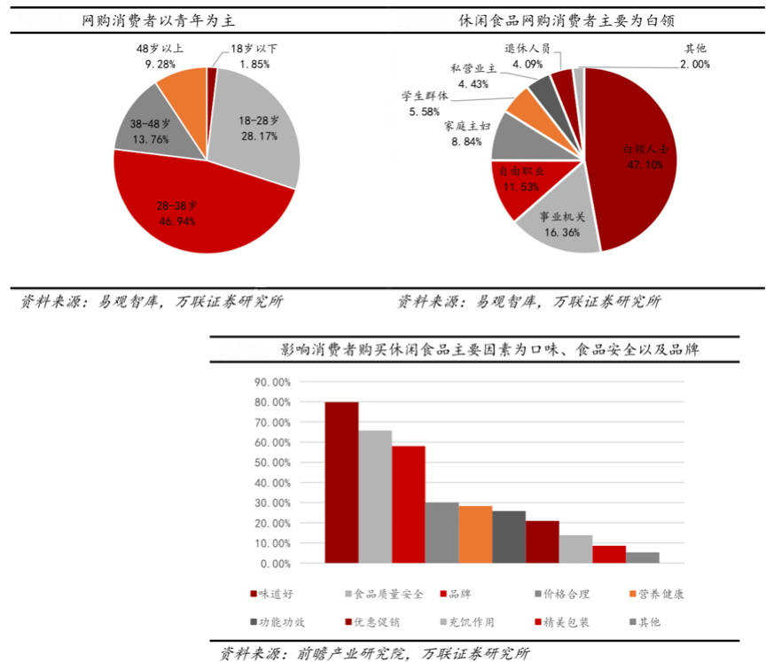 休閑食品年輕化、健康化和品質(zhì)化日益成為休閑食品消費(fèi)的主流,基于“品牌核心價(jià)值引領(lǐng)”的“用戶食品消費(fèi)場(chǎng)景體驗(yàn)”倍受關(guān)注,線下體驗(yàn)店日益受到重視。據(jù)易觀智庫、萬聯(lián)證券研究所等綜合資訊表明,從消費(fèi)者年齡結(jié)構(gòu)看,我國(guó)休閑食品網(wǎng)購消費(fèi)者 75%為18-38歲的年輕消費(fèi)者;從消費(fèi)者職業(yè)特征看, 白領(lǐng)為主要網(wǎng)購消費(fèi)者,占比分別為 47.1%。另外根據(jù)前瞻研究院、萬聯(lián)證券研究所等綜合資訊表明,影響休閑食品網(wǎng)購消費(fèi)者決策的三大主要因素為口味、食品質(zhì)量安全和品牌,分別占到統(tǒng)計(jì)樣本的 79.8%、 65.7%和 58.0%。以三只松鼠為例,企業(yè) 通過建設(shè)線下體驗(yàn)店來達(dá)到品牌立體展示目的,截至 2019 年 6 月,三只松鼠在江、 浙、皖等 17 個(gè)省級(jí)直轄市開設(shè)線下體驗(yàn)店。