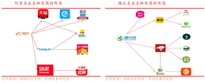 國內生鮮互聯網平臺持續占據著競爭優勢,BAT等互聯網巨頭的“生鮮生態經營”高效推進。根據網絡公開資料、華西證券研究所等綜合資訊表明,阿里直接控股和自建的方式進入生鮮電商領域,包括自建盒馬鮮生,持股高鑫零售(大潤發優選)和蘇寧(蘇寧易購)、收購餓了么、通過天貓和蘇寧投資易果等;騰訊系通過與京東、永輝超市、美團合作的方式進行生鮮電商的布局,并且直接投資了每日優鮮。互聯網巨頭布局相對完整,生鮮電商新零售平臺策劃經營成了“巨頭游戲”。