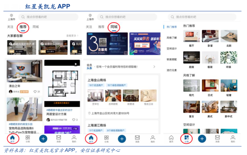 經典案例:紅星美凱龍推出的官方終端 APP 已經實現了“泛家居”網絡營銷,推動了門店數字化、會員數字化等前端數字營銷的高效經營,同步牽引數字運營管理等快速進化。根據紅星美凱龍官方APP、安信證券研究中心等綜合資訊表明,其官方 終端 APP,主推家具建材、家居裝飾、家裝的內容分享,還可提供同城商場詳細的樓層地圖及店鋪分布,為線下商城提供引流。“泛家居”內容營銷能夠相對提升用戶使用頻率,為線下店鋪引流。