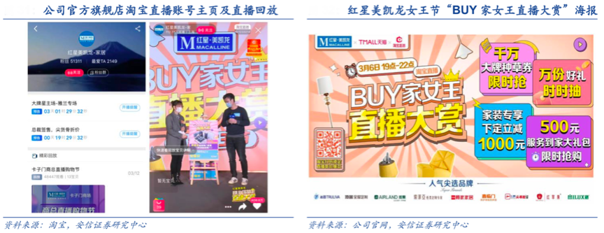 經典案例:根據淘寶網、安信證券研究中心等綜合資訊表明, 2020 年 3 月 6 日,紅星美凱龍女王節“BUY家女王直播大賞”的淘寶直播間中,紅星美凱龍協同 6 城線下分會場,顧家、喜臨門、雅蘭、索菲亞、芝華仕、頂固、沁園、米蘭之窗、紅蘋果等 9 大家居品牌亮相紅星美凱龍淘寶直播間,當晚直播間實時觀看人數超過 112 萬,實現商品點擊超 5.4 萬次,家具爆款下訂 17400 單,“服務到家”居家保潔 業務收獲 2143 個訂單,“紅星美凱龍網家裝平臺”家裝業務達成 3174 個訂單,極大提升了紅星美凱龍的線上線下互動價值。